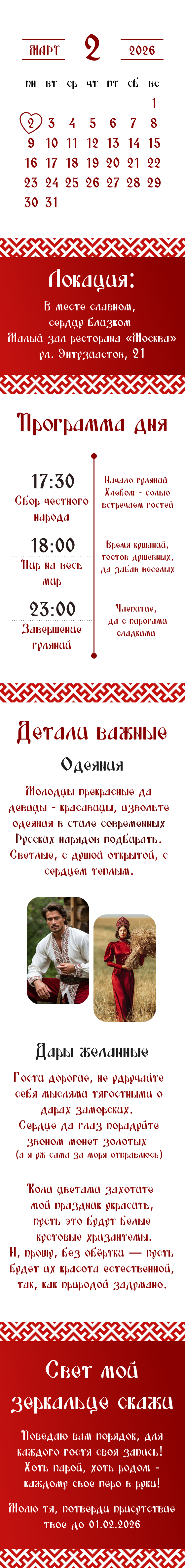 [{"lid":"1740766676177","ls":"10","loff":"","li_parent_id":"","li_type":"in","li_title":"\u0412\u0430\u0448\u0435 \u0418\u043c\u044f \u0438 \u0424\u0430\u043c\u0438\u043b\u0438\u044f","li_name":"name","li_req":"y","li_nm":"name"},{"lid":"1740766676178","ls":"20","loff":"","li_parent_id":"","li_type":"rd","li_title":"\u041f\u0440\u0438\u0441\u0443\u0442\u0441\u0442\u0432\u0438\u0435","li_variants":"\u042f \u043f\u0440\u0438\u0434\u0443\n\u0421\u043c\u043e\u0433\u0443 \u043e\u0442\u0432\u0435\u0442\u0438\u0442\u044c \u043f\u043e\u0437\u0436\u0435\n\u041a \u0441\u043e\u0436\u0430\u043b\u0435\u043d\u0438\u044e, \u043d\u0435 \u0441\u043c\u043e\u0433\u0443 \u043f\u0440\u0438\u0441\u0443\u0442\u0441\u0442\u0432\u043e\u0432\u0430\u0442\u044c ","li_radcb":"rb","li_name":"idy","li_req":"y","li_nm":"idy"},{"lid":"1741019253236","ls":"30","loff":"","li_parent_id":"","li_type":"in","li_title":"\u0411\u0443\u0434\u0435\u0442\u0435 \u043b\u0438 \u0441\u043e \u0432\u0442\u043e\u0440\u043e\u0439 \u043f\u043e\u043b\u043e\u0432\u0438\u043d\u043a\u043e\u0439?","li_name":"duo","li_nm":"duo"},{"lid":"1740766962088","ls":"40","loff":"","li_parent_id":"","li_type":"rd","li_title":"\u0427\u0442\u043e \u0438\u0437 \u043d\u0430\u043f\u0438\u0442\u043a\u043e\u0432 \u043f\u0440\u0435\u0434\u043f\u043e\u0447\u0438\u0442\u0430\u0435\u0442\u0435?","li_subtitle":"\u043c\u043e\u0436\u043d\u043e \u0432\u044b\u0431\u0440\u0430\u0442\u044c \u043d\u0435\u0441\u043a\u043e\u043b\u044c\u043a\u043e \u0432\u0430\u0440\u0438\u0430\u043d\u0442\u043e\u0432","li_variants":"\u0418\u0433\u0440\u0438\u0441\u0442\u043e\u0435 \n\u0412\u0438\u043d\u043e \u0431\u0435\u043b\u043e\u0435 \n\u0412\u0438\u043d\u043e \u043a\u0440\u0430\u0441\u043d\u043e\u0435 \n\u0412\u043e\u0434\u043a\u0430 \n\u041a\u043e\u043d\u044c\u044f\u043a \n\u0412\u0438\u043d\u043e\/\u043f\u0438\u0432\u043e \u0431\u0435\u0437 \u0430\u043b\u043a\u043e\u0433\u043e\u043b\u044f ","li_radcb":"cb","li_name":"alcogol","li_req":"y","li_nm":"alcogol"}]
